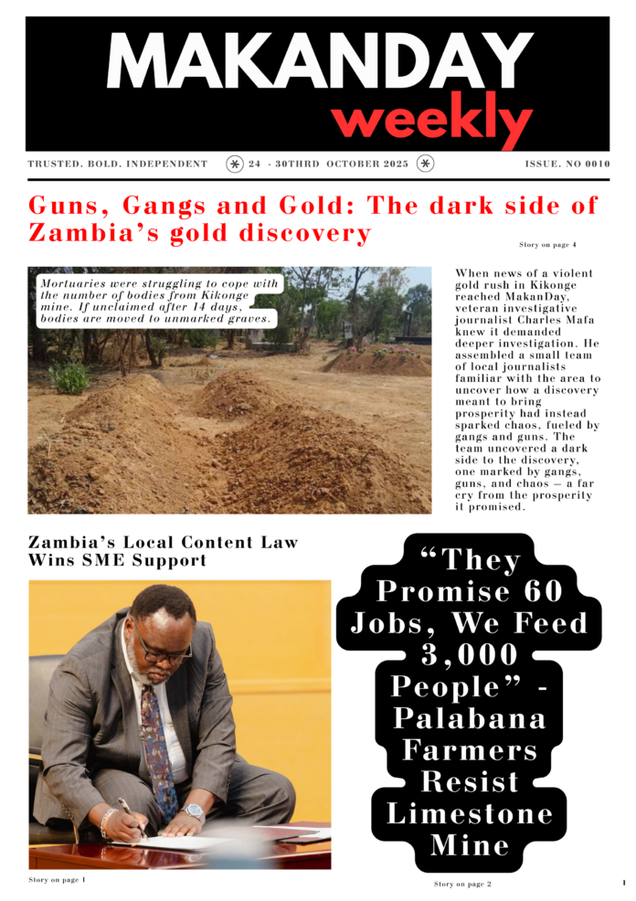 HomeMakanDay E-NewsMAKANDAY WEEKLY! MakanDay E-News MAKANDAY WEEKLY! By Editor October 24, 2025 0 43 Share FacebookTwitterPinterestWhatsApp MakanDay E-News Weekly paper 0010Download Share this:TwitterFacebookLike this:Like Loading... Related Discover more from MAKANDAY Subscribe to get the latest posts sent to your email. Type your email… Subscribe Share FacebookTwitterPinterestWhatsApp Previous articleGold, Chaos and Cooperatives: Can a Broken System Restore Order at Kikonge? Editorhttp://www.gracezambia.blogspot.com/ RELATED ARTICLES MakanDay E-News MAKANDAY WEEKLY! October 17, 2025 MakanDay E-News MAKANDAY WEEKLY! October 10, 2025 MakanDay E-News MAKANDAY WEEKLY! October 3, 2025 Leave a ReplyCancel reply Most Popular Gold, Chaos and Cooperatives: Can a Broken System Restore Order at Kikonge? October 23, 2025 “They Promise 60 Jobs, We Feed 3,000 People” – Palabana Farmers Resist Limestone Mine October 23, 2025 Zambia’s Local Content Law Wins SME Support October 22, 2025 Journalism is increasingly treated as a crime in Zimbabwe. October 22, 2025 Load more Recent Comments