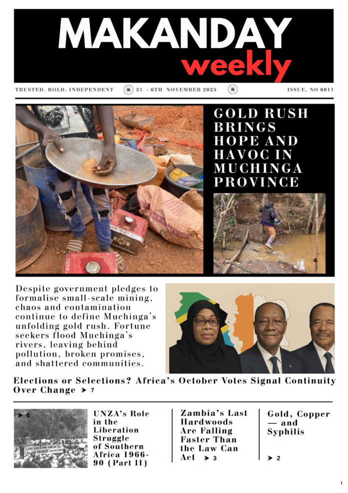 HomeUncategorizedMAKANDAY WEEKLY! Uncategorized MAKANDAY WEEKLY! By Editor October 31, 2025 0 66 Share FacebookTwitterPinterestWhatsApp MakanDay E-News Weekly paper 011Download Share this:TwitterFacebookLike this:Like Loading... Related Discover more from MAKANDAY Subscribe to get the latest posts sent to your email. Type your email… Subscribe Share FacebookTwitterPinterestWhatsApp Previous articleGold Rush Brings Hope and Havoc in Muchinga Province Editorhttp://www.gracezambia.blogspot.com/ RELATED ARTICLES Uncategorized Power, Politics, and Procurement: How ZAMMSA Lost Its Independence October 9, 2025 Editor's Choice Supreme Court Orders Government to Pay Over K669,000 to Whistleblower August 1, 2025 Editor's Choice Sell Outs | Zambia June 30, 2025 Leave a ReplyCancel reply Most Popular Gold Rush Brings Hope and Havoc in Muchinga Province October 31, 2025 ! LAST CALL FOR ENTRIES ! October 30, 2025 Zambia’s Last Hardwoods Are Falling Faster Than the Law Can Act October 29, 2025 Gold, Copper—and Syphilis October 27, 2025 Load more Recent Comments