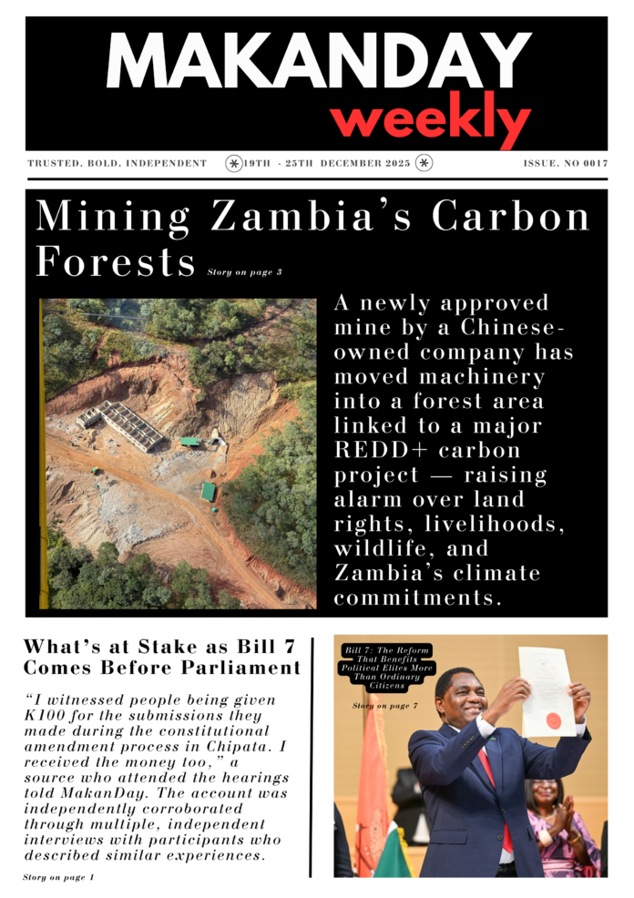 HomeMakanDay E-NewsMakanDay E-NewsMAKANDAY WEEKLY! MakanDay E-News MAKANDAY WEEKLY! By Editor December 19, 2025 0 33 Share FacebookTwitterPinterestWhatsApp MakanDay E-News Weekly paper 017_20251219_084556_0000Download Share this:TwitterFacebookLike this:Like Loading... Related Discover more from MAKANDAY Subscribe to get the latest posts sent to your email. Type your email… Subscribe Share FacebookTwitterPinterestWhatsApp Previous articleLicenced to Pollute: Inside Zambia’s Copperbelt Pollution Crisis Editorhttp://www.gracezambia.blogspot.com/ RELATED ARTICLES MakanDay E-News MAKANDAY WEEKLY! December 12, 2025 MakanDay E-News MAKANDAY WEEKLY! December 5, 2025 MakanDay E-News MAKANDAY WEEKLY! November 28, 2025 Leave a ReplyCancel reply Most Popular Licenced to Pollute: Inside Zambia’s Copperbelt Pollution Crisis December 18, 2025 Mining Zambia’s Carbon Forests December 15, 2025 What’s at Stake as Bill 7 Comes Before Parliament December 15, 2025 MAKANDAY WEEKLY! December 12, 2025 Load more Recent Comments