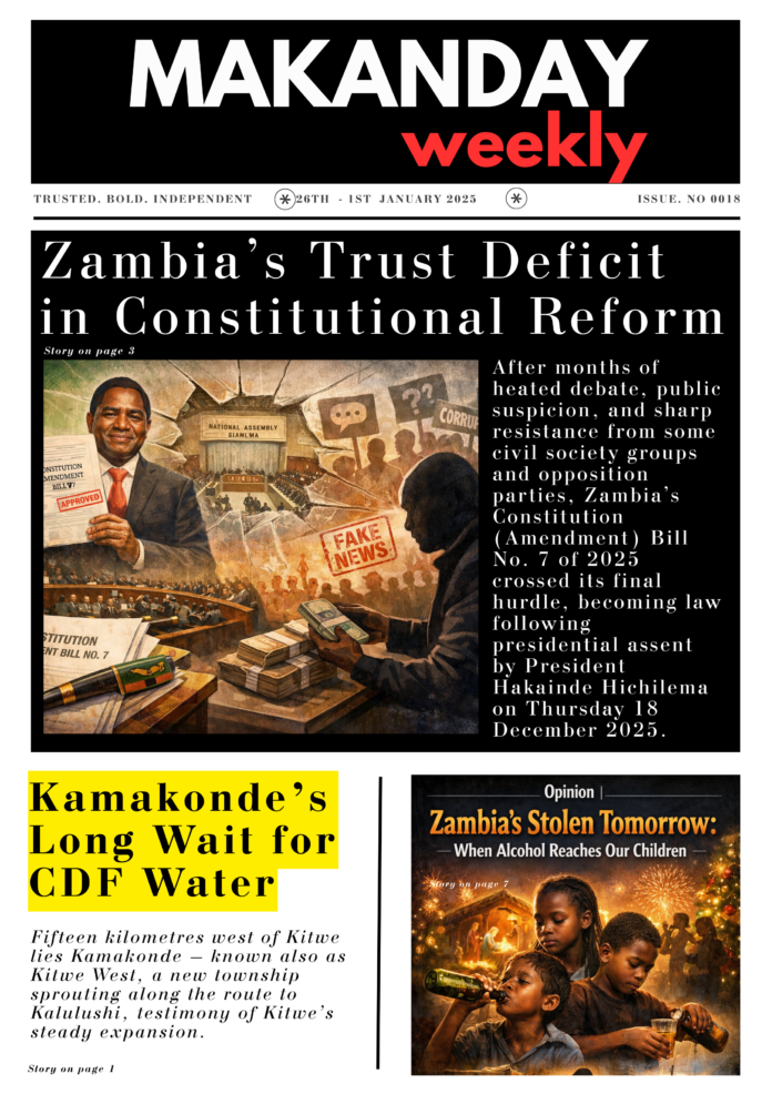 HomeMakanDay E-NewsMakanDay E-NewsMAKANDAY WEEKLY! MakanDay E-News MAKANDAY WEEKLY! By Editor December 26, 2025 0 40 Share FacebookTwitterPinterestWhatsApp MakanDay E-News Weekly paper 018Download Share this:TwitterFacebookLike this:Like Loading... Related Discover more from MAKANDAY Subscribe to get the latest posts sent to your email. Type your email… Subscribe Share FacebookTwitterPinterestWhatsApp Previous articleOpinion | Zambia’s Stolen Tomorrow: When Alcohol Reaches Our Children Editorhttp://www.gracezambia.blogspot.com/ RELATED ARTICLES MakanDay E-News MAKANDAY WEEKLY! December 19, 2025 MakanDay E-News MAKANDAY WEEKLY! December 12, 2025 MakanDay E-News MAKANDAY WEEKLY! December 5, 2025 Leave a ReplyCancel reply Most Popular Opinion | Zambia’s Stolen Tomorrow: When Alcohol Reaches Our Children December 26, 2025 Zambia’s Trust Deficit in Constitutional Reform December 22, 2025 OPINION: Bill 7 – The Reform That Benefits Political Elites More Than Ordinary Citizens December 20, 2025 Kamakonde’s Long Wait for CDF Water December 19, 2025 Load more Recent Comments