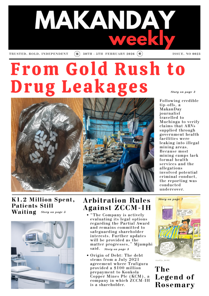 HomeMakanDay E-NewsMakanDay E-NewsMAKANDAY WEEKLY! MakanDay E-News MAKANDAY WEEKLY! By Editor January 30, 2026 0 88 Share FacebookTwitterPinterestWhatsApp MakanDay E-News Weekly paper 0023Download Share this:TwitterFacebookLike this:Like Loading... Related Discover more from MAKANDAY Subscribe to get the latest posts sent to your email. Type your email… Subscribe Share FacebookTwitterPinterestWhatsApp Previous articleK1.2 Million Spent, Patients Still WaitingNext articleOPINION: Illegal Mining Is Also a Public Health Crisis Editorhttp://www.gracezambia.blogspot.com/ RELATED ARTICLES MakanDay E-News MAKANDAY WEEKLY! January 23, 2026 MakanDay E-News MAKANDAY WEEKLY! January 16, 2026 MakanDay E-News MAKANDAY WEEKLY! January 9, 2026 Leave a ReplyCancel reply Most Popular Government Probes ARV Leakages Exposed by MakanDay January 30, 2026 OPINION: Illegal Mining Is Also a Public Health Crisis January 30, 2026 K1.2 Million Spent, Patients Still Waiting January 29, 2026 Arbitration rules against ZCCM-IH January 27, 2026 Load more Recent Comments