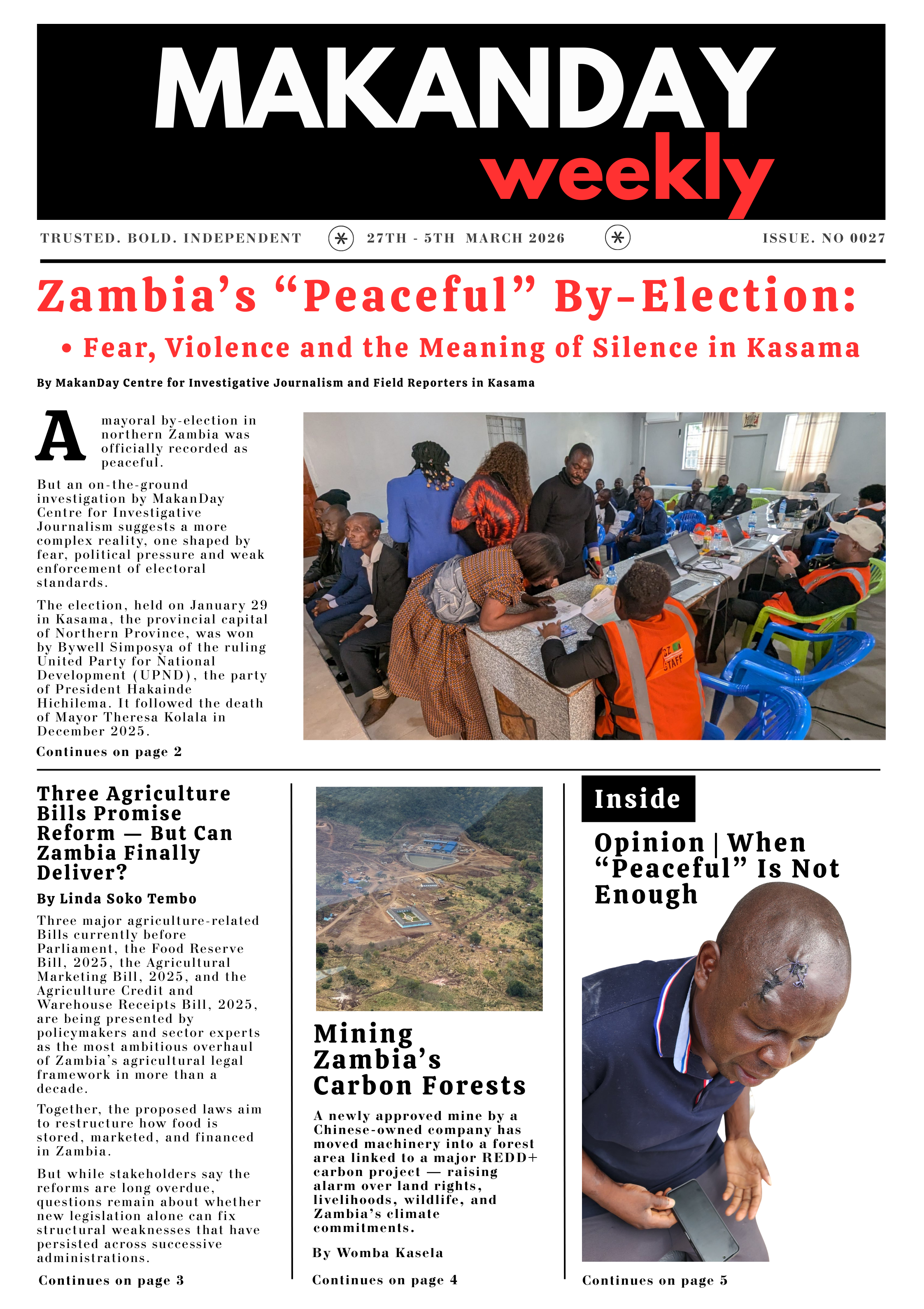 HomeMakanDay E-NewsMakanDay E-NewsMAKANDAY WEEKLY! MakanDay E-News MAKANDAY WEEKLY! By Editor February 27, 2026 0 55 Share FacebookTwitterPinterestWhatsApp MakanDay E-News Weekly paper 0027Download Share this:TwitterFacebookLike this:Like Loading... Related Discover more from MAKANDAY Subscribe to get the latest posts sent to your email. Type your email… Subscribe Share FacebookTwitterPinterestWhatsApp Previous articleOpinion | When “Peaceful” Is Not Enough Editorhttp://www.gracezambia.blogspot.com/ RELATED ARTICLES MakanDay E-News MAKANDAY WEEKLY! February 20, 2026 MakanDay E-News MAKANDAY WEEKLY! February 13, 2026 MakanDay E-News MAKANDAY WEEKLY! January 30, 2026 Leave a ReplyCancel reply Most Popular Opinion | When “Peaceful” Is Not Enough February 27, 2026 Zambia’s “Peaceful” By-Election: Fear, Violence and the Meaning of Silence in Kasama February 25, 2026 Three Agriculture Bills Promise Reform — But Can Zambia Finally Deliver? February 24, 2026 MAKANDAY WEEKLY! February 20, 2026 Load more Recent Comments