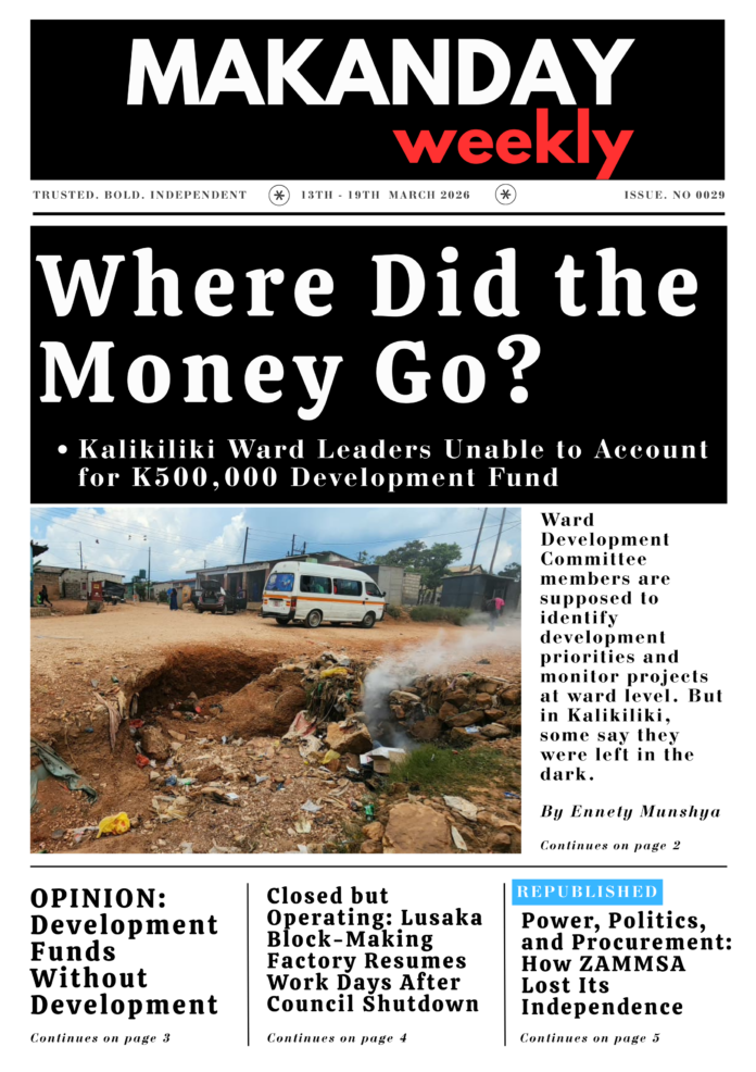 HomeMakanDay E-NewsMakanDay E-NewsMAKANDAY WEEKLY! MakanDay E-News MAKANDAY WEEKLY! By Editor March 13, 2026 0 41 Share FacebookTwitterPinterestWhatsApp MakanDay E-News Weekly paper 0029Download Share this:TwitterFacebookLike this:Like Loading... Related Discover more from MAKANDAY Subscribe to get the latest posts sent to your email. Type your email… Subscribe Share FacebookTwitterPinterestWhatsApp Previous article Editorhttp://www.gracezambia.blogspot.com/ RELATED ARTICLES MakanDay E-News MAKANDAY WEEKLY! March 6, 2026 MakanDay E-News MAKANDAY WEEKLY! February 27, 2026 MakanDay E-News MAKANDAY WEEKLY! February 20, 2026 Leave a ReplyCancel reply Most Popular March 11, 2026 Closed but Operating: Factory Resumes Work Days After Council Shutdown March 9, 2026 How Malawi’s “Bank for the Poor” Became a Private Credit Line for the Politically Connected March 6, 2026 MAKANDAY WEEKLY! March 6, 2026 Load more Recent Comments