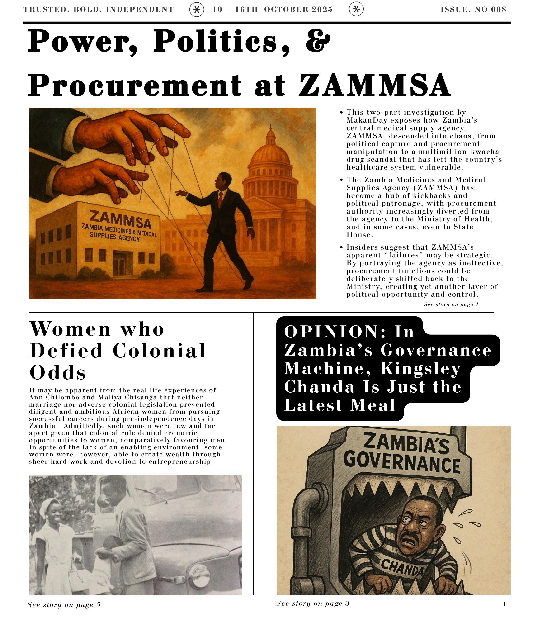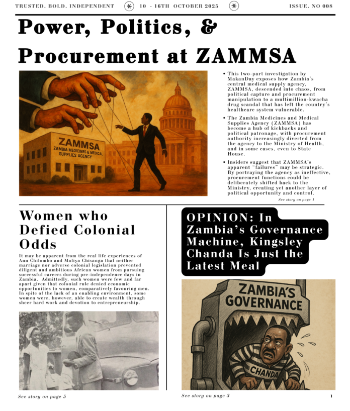 HomeMakanDay E-NewsMakanDay E-NewsMAKANDAY WEEKLY! MakanDay E-News MAKANDAY WEEKLY! By Editor October 10, 2025 0 73 Share FacebookTwitterPinterestWhatsApp MakanDay E-News Weekly paper 008Download Share this:TwitterFacebookLike this:Like Loading... Related Discover more from MAKANDAY Subscribe to get the latest posts sent to your email. Type your email… Subscribe Share FacebookTwitterPinterestWhatsApp Previous articlePower, Politics, and Procurement: How ZAMMSA Lost Its IndependenceNext articleBoma yanganepo pays off Editorhttp://www.gracezambia.blogspot.com/ RELATED ARTICLES MakanDay E-News MAKANDAY WEEKLY! October 3, 2025 MakanDay E-News MAKANDAY WEEKLY! September 26, 2025 MakanDay E-News MAKANDAY WEEKLY! September 19, 2025 Leave a ReplyCancel reply Most Popular Boma yanganepo pays off October 10, 2025 Power, Politics, and Procurement: How ZAMMSA Lost Its Independence October 9, 2025 In Zambia’s Governance Machine, Kingsley Chanda Is Just the Latest Meal October 8, 2025 Alick Nkhata’s Musical Legacy October 7, 2025 Load more Recent Comments