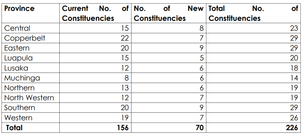 “In determining the 70 constituencies, the Commission was guided by the factors as outlined in the Constitution which place a duty on the Commission to consider the history, diversity and cohesiveness of communities; population density, trends and projections; geographical features; means of communication; the need to keep constituencies within districts; and the need to pursue approximate equality of population while still protecting adequate representation for urban and sparsely populated areas,’’ said ECZ chairperson Mwangala Zaloumis.