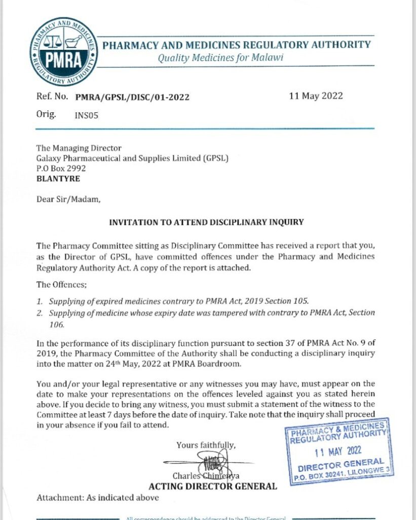 “The Pharmacy Committee, sitting as Disciplinary Committee, has received a report that you, as the Director of GPSL, have committed offences under the Pharmacy and Medicines Regulatory Authority Act,” reads part of the letter